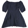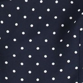 • A: The dress is decorated with an allover polka dot pattern, adding a playful touch.