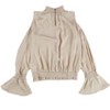 The solid allure is enhanced by the long bell split sleeves - a conversation starter. An intricate two-button & loop closure graces the back, revealing a tantalizing keyhole. But what steals the show is the elastic trim, adding that hint of casual chic. Donning this blouse is not just a fashion choice; it's a romance with artistry.