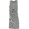 • A: The dress includes ruching accents and a striped pattern, enhancing its modern and chic appearance.