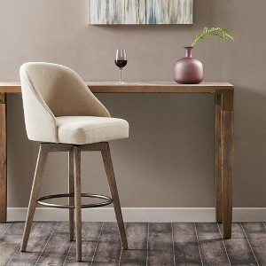Description Beautifully crafted, the Madison Park Pearce Barstool with Swivel Seat introduces a perfect blend of simplicity and sophistication. This barrel style counter stool features a swivel function, allowing you to easily rotate the upholstered seat. A smooth reclaimed grey finish on the rubber wood legs creates a clean transitional look, while a matte metal ring provides the perfect footrest. The smooth and graceful curves of this counter stool form an elegant silhouette that adds a handsome touch to your dining room. Assembly is required. Max weight capacity: 300 lbs. Product Details See below 1 Bar Stool:20inW x 23inD x 42.5inH Seat Dimension:20inW x 18inD x 30inH Seat Cushion Thickness:4.5in Upper legs:2inW x 1.375inH Bottom legs:1.125inW x 1inH Height:24.25inH Footrest to Floor Height:11.5inH Back Rest Size:15inW x 12.5inH Maximum Weight Capacity (Seating):300 LB Material Material: Solid wood and plywood frame, upholstered seat and back and bronze metal ring footrest Leg Material: Solid wood Arm Material: Solid wood and plywood Cushion or Upholstery Fill Material: Foam Back Fill Material: Foam Wood Finish: Reclaimed grey smooth Metal Finish: Bronze Fabric Composition: 92% polyester; 8% linen Seat Construction: Sinuous springs