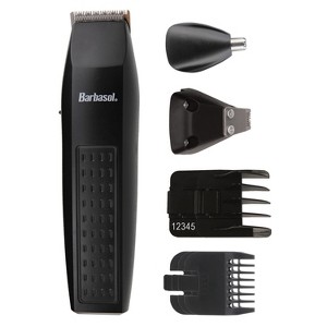 The Barbasol Battery-Powered 7-Piece All-in-1 Grooming Set comes with 3 interchangeable, stainless steel shaving attachments for your device. The beard trimmer refines and styles tricky areas like under the nose, sideburns and beards. Coupled with the ear and nose trimmer and grooming comb, you'll have everything you need to keep your hair neat and clean. Included in this kit is a convenient stand to keep all of the attachments and tools neatly organized in your grooming area._