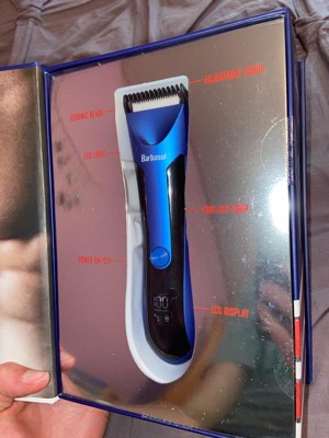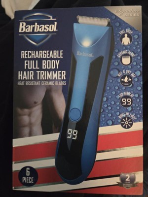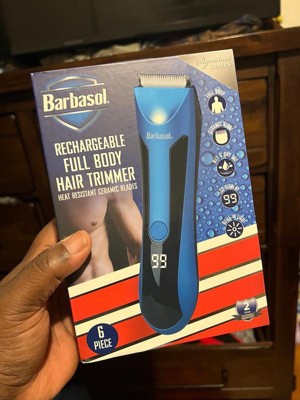 Stay smooth and confident with the Barbasol Rechargeable Cordless Body Hair Trimmer for Men. This all-in-one full body and face trimmer for men is easy to use and perfect for trimming your body from head to toe. The sharp ceramic blades give you a clean cut without pulling or irritation. With no cords to get in the way, this hair trimmer makes grooming simple and fast. The LCD screen shows your battery level, so you always know when it’s time to recharge your hair trimmer. It runs up to 90 minutes on a full charge, giving you plenty of time to trim without rushing. The built-in light helps you see every spot, making this beard trimmer perfect for detailed grooming. You can even use the adjustable comb to shape your beard or trim different lengths. This body hair trimmer for men is fully waterproof, so you can use it in the shower or rinse it clean afterward. The ceramic blades stay cool and are gentle, even on sensitive areas, for safe trimming every time. Our body hair trimmer is easy to clean, easy to use, built for comfort, and includes a shaving oil and a small brush to assist you further. Trim and groom easily with Barbasol Rechargeable Cordless Body Hair Trimmer for Men!