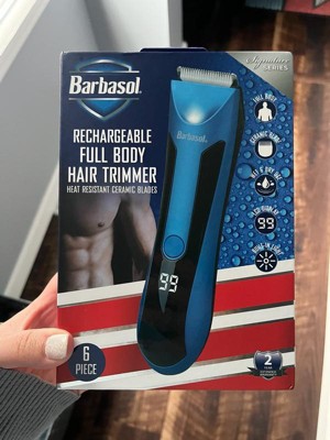 [This review was collected as part of a promotion.] So I finally got to use the Barbasol rechargeable full-body hair trimmer with heat-resistant ceramic blades. It’s a compact little trimmer, and I was pretty surprised by how well it worked. I even used it to thin down my eyebrows since they were a bit bushy on both sides, and it did a great job trimming them. To test the power of the blades, I shaved a strip of hair off my arm. Being a pretty hairy guy, I was shocked at how easily it cut through. Honestly, this thing could even shave a full-grown bald head. The only downside is that it doesn’t do well with really short chin hair—if you’ve just got light stubble on your chin, it won’t catch much. But if you have a full beard, it works great. This full-body trimmer comes with ceramic blades, works wet or dry, and has an LCD display with built-in lights. You also get a two-year extended warranty, a six-piece set of attachments, a travel bag, and blade oil for lubrication. It’s fully waterproof, which I love. It even comes with a little stand and a charging connector in the back for easy rechargeable use. Right now, this is my go-to tool for any small trimming I need to do.