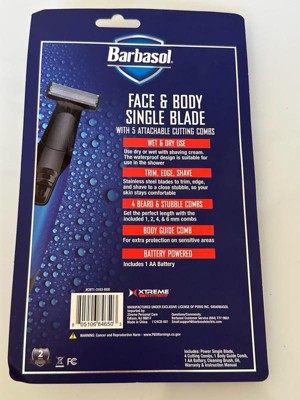 Getting the right shave any time of day, requires the best tools for the job a man needs. The Barbasol® Battery-Powered Single Blade Shaver (cuts in both directions) allows you to take control of your messy facial hair instantly. This trimmer will cut you to stubble and the new added body grooming comb is a game changer for this tool. Whether it’s with shaving cream, in the shower, or directly on your face, our device works in any scenario. Trim, edge or fully shave your face as close as possible, without sacrificing your comfort. Our stainless-steel blades are rust-proof and can be easily cleaned after frequent use without damaging them. Included are 4 guide combs for different hair lengths to provide the best look to your beard/stubble. The body grooming comb guide to help keep you well groomed at all times for any male. Our shaver is battery-powered and Includes 1 AA to fully function. To keep it working, and looking it’s best, we’ve also provided a cleaning brush and oil to help with that. Keep your facial hair looking presentable with the Battery-Powered Single Blade Shaver.