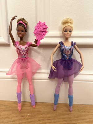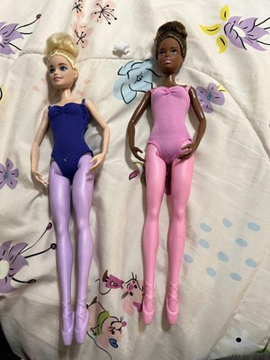 The Barbie Ballet Room doll set is the ticket to dance dreams with two beautiful ballerina dolls and themed accessories! With 'en pointe' sculpted shoes, each doll can go from practice to performance with a classic leotard and a performance one. Top-knot ballet buns complete their ballet looks. Nine additional pieces, including leg warmers and a bouquet, let imaginations take center stage! Dolls cannot stand or dance alone. Colors and decorations may vary.