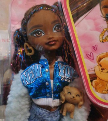 - Barbie "Brooklyn" doll features long black hair, styled in multiple ponytails, with shiny highlights throughout to showcase the character's creative personality!