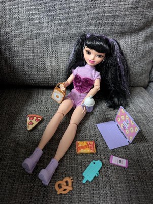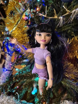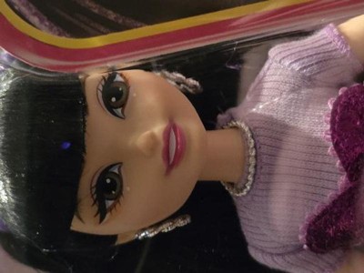 - Doll is posable and wearing removable fashions, like her sparkly purple-heart crop top, purple denim shorts and boots!