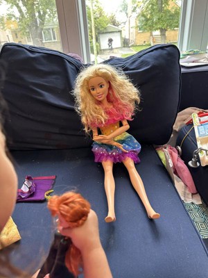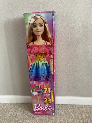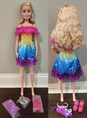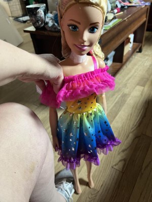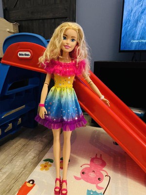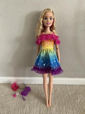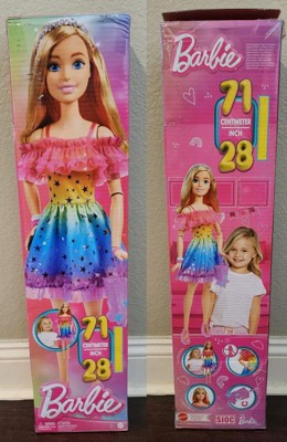 - Dazzling in a rainbow dress, this large Barbie doll stands over two feet tall! Her colorful look and styling accessories encourage fashion play and storytelling that is larger than life.