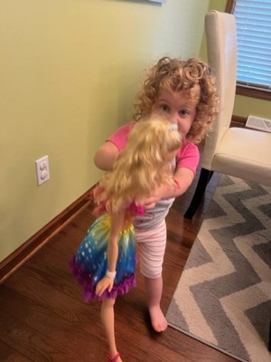 I bought this for my great granddaughter for Christmas so she doesn’t have it yet. But her mom and myself know she will love it. She loves her dolls and this Barbie will be a wonderful surprise. Do wish they had some clothes that fit her because she does like to change her dolls clothes.