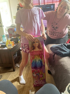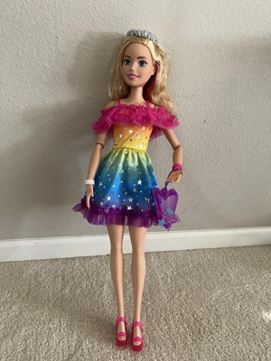 This poseable, large Barbie doll has the same Barbie charm that kids know and love, but expanded to a 28-inch-tall frame. After all, more Barbie means even more fun! She rocks a rainbow dress that shines with stars, and carries a purple purse that can store her included headband and bracelet accessories. Doll cannot stand alone. Colors and decorations may vary.