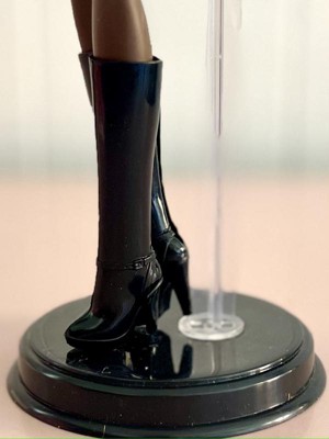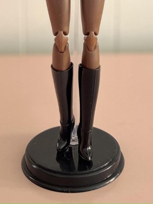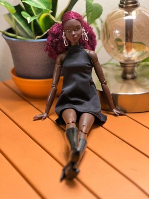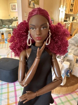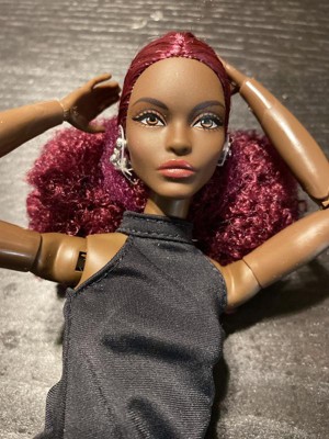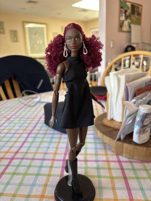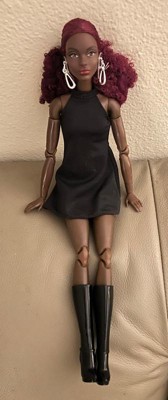 [This review was collected as part of a promotion.] The Barbie Basics Model number 3 doll is a solidly constructed doll. Her hair is a beautiful almost cranberry/cherry tone of gorgeously curly, doily hair, it’s tied back in a neat ponytail that shows off her silver toned earrings and her makeup nicely. My doll arrived with some small, but noteworthy defects, the top issue is a paint mark between her brows that will need to be removed somehow as it takes away from her sculpt and styling. Her earrings have some places where the silver toned paint has chipped, exposing the plastic beneath, however they are a beautiful dangle style and this issue doesn’t take away from the overall effect. Her skin tone is deep and gorgeously brown, but some casting/finishing marks on her show up more prominently in a darker skin toned doll. She’s the tall body style and her made to love joints move and pose beautifully even if there are marks and indentations on her limbs. Her dress and boots are cute, with nice sculpting on the shoes and a flirty hem on her basic black dress. Overall she is a stunning doll, and her new neck switch feature allows me to play and dress her on any of the bodies from the basics line. Overall, a wonderful addition to the Barbie line, though I wish her fave paint wasn’t slightly defective.
