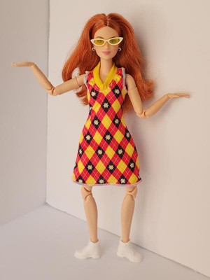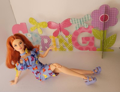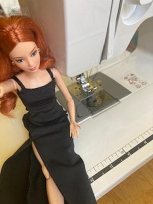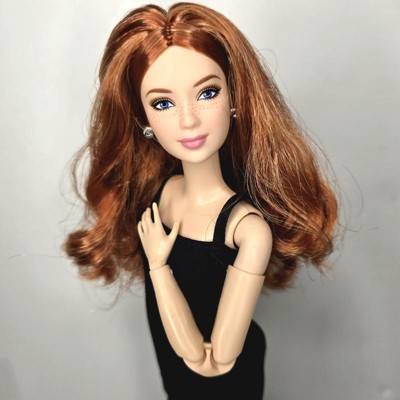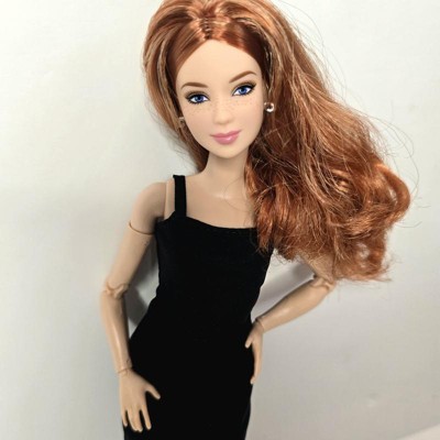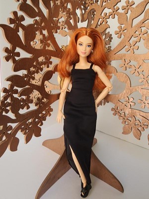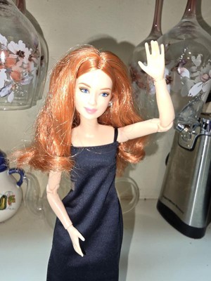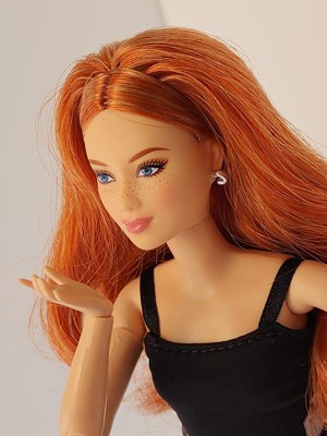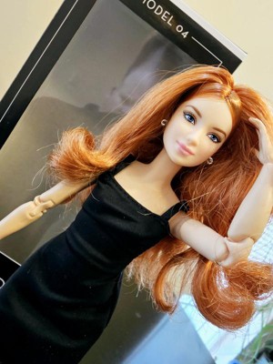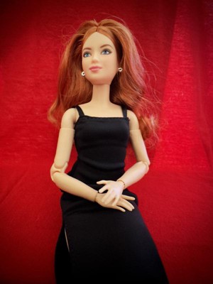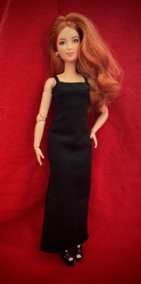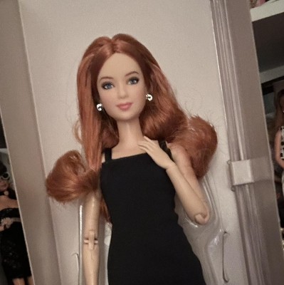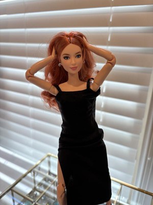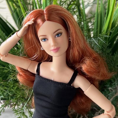 [This review was collected as part of a promotion.] This is the Barbie Basics little black dress doll #4 Caucasian with red hair. Her hair is actually red and blonde blended together, which makes for a beautiful, bold, but natural color. The hair is well rooted, with a middle part and classic do'. It feels silky and has a little curl/ body wave. Not too thin or sparse as some dolls can have. Her face details look realistic without being creepy, as she still looks like Barbie. I like the freckles and eyelash/ eyebrow details. I also like the realistic makeup she has. This is a poseable, articulated doll. The joints are stiff enough to hold their position with gentle pressure to move them. Only one elbow joint felt stiffer than the rest and took a little more force to move. I was able to do a photo shoot with her in different poses that a traditional Barbie cannot do. One thing, however, she can't do that a traditional Barbie can do, it's twist her waist. I think one more jointed area in her waist would do. Especially if it allowed her side-to-side motion as well as a twist. I also think Barbies' feet are still unnaturally small, but I like that she can stand flat or wear heels due to the ankle joint allowing her toe to point. Her shoes are stylish and cute, and go on easily. They stay on, but come off easily as well. Her dress is a very simple cut of fabric with a velcro closure. She is a slim doll, so I don't know how well her dress would fit another doll. It definitely would not fit a curvy or OG doll. I, personally, wish they would add a back 'panel' that is removable to add or subtract to fit different dolls. Or maybe have different closures you can overlap for smaller dolls. Final word: I really like this doll. Check out her photo shoot (and dance moves!) in my pics.