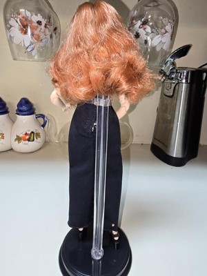 [This review was collected as part of a promotion.] So I'm reviewing the red headed Basics Barbie. I thought she was a very pretty red head and I was right. She has a beautiful shade of red, long hair with a bit of a flip on the ends. And there's a lot of thick hair. She has a pretty face and even has freckles, which I love. She has articulated arms, legs, knees, ankles, elbows and hands. She also turns just below her chest and just below her shoulders and on her upper thighs. It gives the doll extra movement and greatly helps in posing her. Her neck is a little bit too lose so when I held her and let her head lean back, her head would fall back. She wears a long basic black dress (every woman should have a little black dress, right?). It has a thigh high split up one side of her legs. She also comes wearing black, strappy wedge shoes and a clear, acrylic stand, but it's difficult to get it to stay on her, either over her dress or under it. The Barbie isn't going to move around in the package because it's attached everywhere. It also comes with a certificate of authenticity. Which is a nice little touch. I've always been fond of Barbie and she is no exception. I think every little girl and even grown women who collect them, would love to own either of the basics Barbie's. I'm happy to have this lovely lass in my collection for years to come.