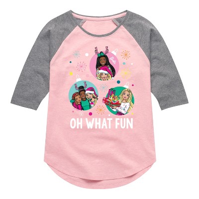 Barbie - Butterflies Flutter - Toddler And Youth Girls Raglan Graphic T-Shirt - Step into the glamorous pink world of Barbie with our officially licensed graphic garments for the fashion-forward! Whether you dream of being a fashion designer, a mermaid princess, or a world-traveling explorer, our garments bring Barbie's world to life with vibrant colors and playful prints. Crafted with quality materials and attention to detail, each piece ensures comfort and durability for all-day play. Express your unique sense of style and imagination with our exclusive Barbie graphic apparel!