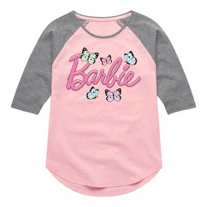 Barbie - Butterflies Flutter - Toddler And Youth Girls Raglan Graphic T-Shirt - Step into the glamorous pink world of Barbie with our officially licensed graphic garments for the fashion-forward! Whether you dream of being a fashion designer, a mermaid princess, or a world-traveling explorer, our garments bring Barbie's world to life with vibrant colors and playful prints. Crafted with quality materials and attention to detail, each piece ensures comfort and durability for all-day play. Express your unique sense of style and imagination with our exclusive Barbie graphic apparel!