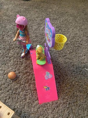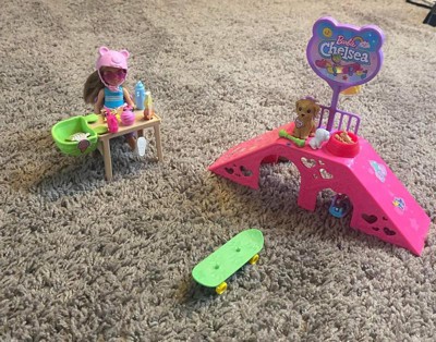 - Chelsea doll and her two puppies are headed to the skatepark with this Barbie playset that includes a skate ramp, picnic area, basketball hoop and 15+ accessories!