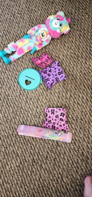 [This review was collected as part of a promotion.] My 6 yr old loved the care bear outfit and doll. It came with cute accessories. She enjoyed finding out which bear she had and which doll. She loves the blue streaks in her hair and the accessories. She played with it for a little while and added her to her collection of favorite toys she plays in the bath in.