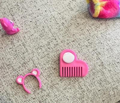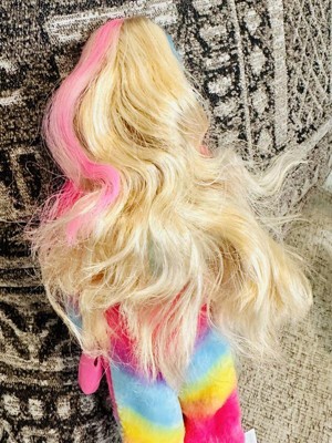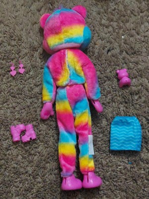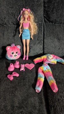 [This review was collected as part of a promotion.] Love this doll. Very little complaints. To start I love the plush care bear costume. So colorful. I would have liked if the gloves were fabric but not a big deal. Love the heart detail on them. Unfortunately when you remove the care bear head, Barbie’s hair is damaged. Even brushing it doesn’t do much to help. I LOVE her makeup. Great attention to detail. Comes with boots, skirt, headband, earrings, comb and a small care bear (adorable!). The care bear costume top is reversible and can be used with the skirt. Very cute. But was a little difficult to turn inside out. The drop earrings are so cute. The hair streaks do change color depending on water temperature. Over all a nice doll.