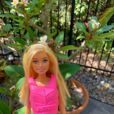 - Slip the hot-pink life vest over Barbie doll's colorful swimsuit, then hit the water!