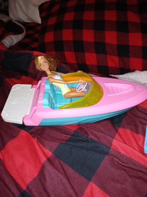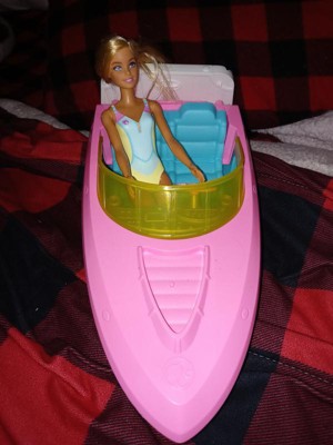 Imaginations can take their stories from land to sea with Barbie doll, her pet puppy and a boat that floats in water! With cool features, a colorful design and room for three dolls (other dolls sold separately), kids can load the speedboat up and take it on all kinds of adventures. Slip Barbie doll into the hot-pink life vest and ride through the waves, then park the boat to lounge with plug-and-play cupholders and beverage accessories. Whether 3 to 7 year olds take this Barbie boat out on the water or imagine their own ocean of fun, the playtime possibilities are endless! Doll cannot swim or stand alone. Colors and decorations may vary. Parental supervision required.