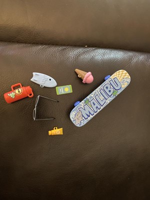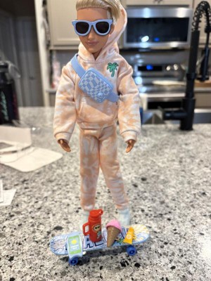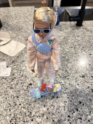 [This review was collected as part of a promotion.] We liked this Ken doll. His hair is long, "real" fake hair plastered into this style! Cute accessories like the shark shaped phone case and skateboard. We wish that his crossbody bag actually opened. This poor Ken cannot do the splits.