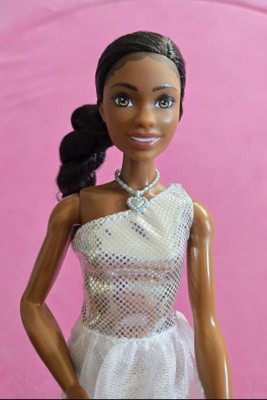 [This review was collected as part of a promotion.] Beautiful Barbie added to our collection. My daughter loved this Barbie. The hair is really nice and long. The accessories included were very nice and detailed. The silver dress is very shiny and sparkles. The necklace is easy to put on however sometimes falls off. The handbag is easy to hold in Barbie’s hand.