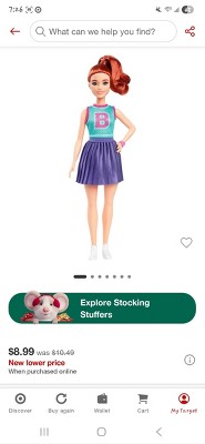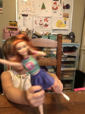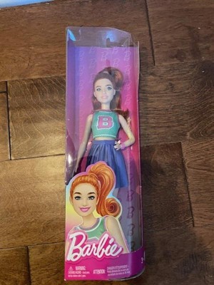 [This review was collected as part of a promotion.] My daughter took a liking to this Barbie as soon as she saw her. She has long red hair in a ponytail and a cheerleaderesque outfit with a purple pleated skirt and a green cropped tank with a B on it. She is also wearing a watch and white shoes. She is just a typical Barbie in the sense that she has no special features, but it seems the the outfits really make the doll.