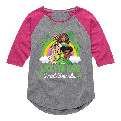 Barbie - Friendship Goals - Toddler And Youth Girls Raglan Graphic T-Shirt - Step into the glamorous pink world of Barbie with our officially licensed graphic garments for the fashion-forward! Whether you dream of being a fashion designer, a mermaid princess, or a world-traveling explorer, our garments bring Barbie's world to life with vibrant colors and playful prints. Crafted with quality materials and attention to detail, each piece ensures comfort and durability for all-day play. Express your unique sense of style and imagination with our exclusive Barbie graphic apparel!