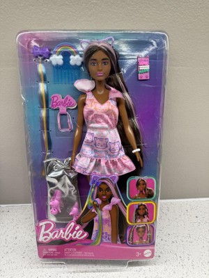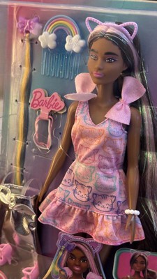 [This review was collected as part of a promotion.] We loved this doll !,, so much we love cats so finally a Barbie with the dress with cats how cute her hair braid like little cats ears ,,! Her long hair with hits of color perfection my granddaughter loved her she kept wanting to bend her legs and arms and she could not a softer material would be great for younger girls my granddaughter plays with this doll the most she tells the cat this is your Mommy lol how cute she loves the dress wish it was made to move body and a little cat purse would have been delightful or a little tote with a picture of a cat lol the cat Barbie loved this doll outfit and colors favorite of my granddaughter