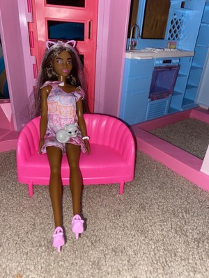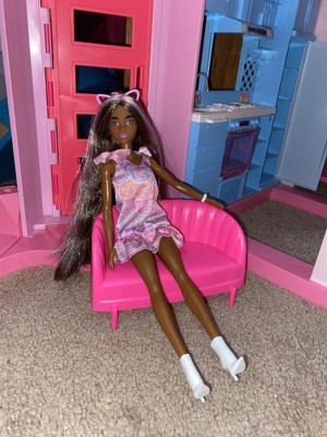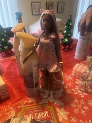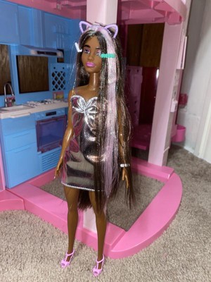 [This review was collected as part of a promotion.] Beautiful brunette Barbie. Her subtle makeup is very pretty and her long hair is beautiful and soft. It has pink and glittery strands and it also comes with hair extensions. Fun doll to style with different accessories. She wears a cute short dress with a kitty face pattern but the metallic dress takes the prize! Gorgeous.