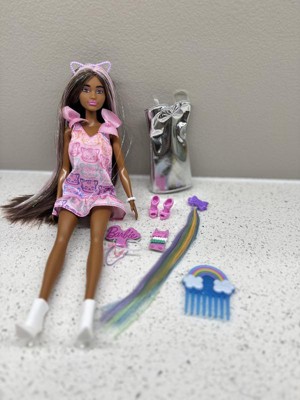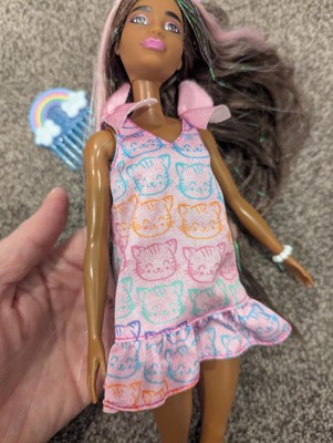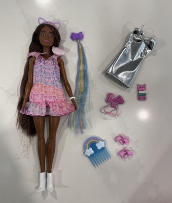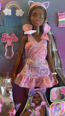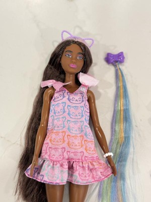 [This review was collected as part of a promotion.] This has been a very popular addition to my daughter's Barbie collection. Her hair is probably the favorite feature... It is very long and the doll comes with several fun hair accessories, like clips and extensions. We love the cat dress, and the second outfit and shoes are really fun too. If I had to make one minor complaint, it is that the doll's cat dress seems a little lower in quality that what we expect from Mattel. Overall though, very fun and great hair.