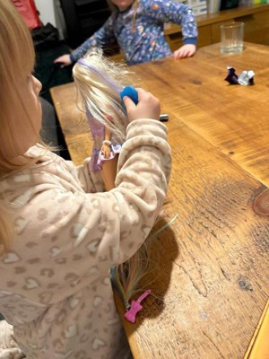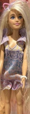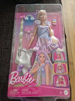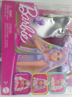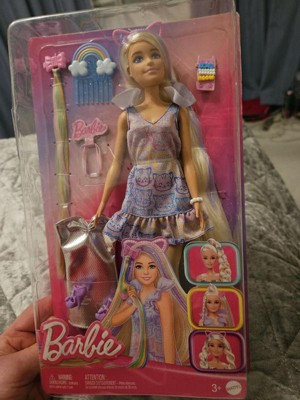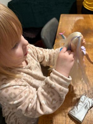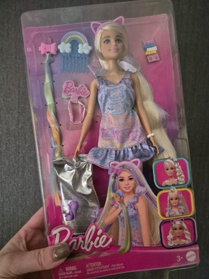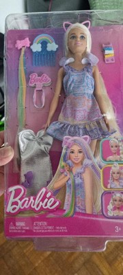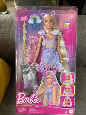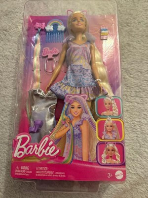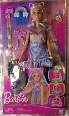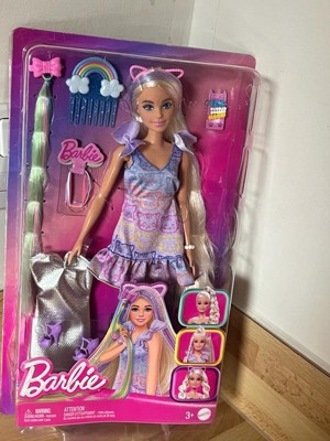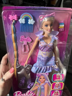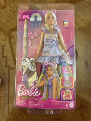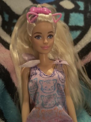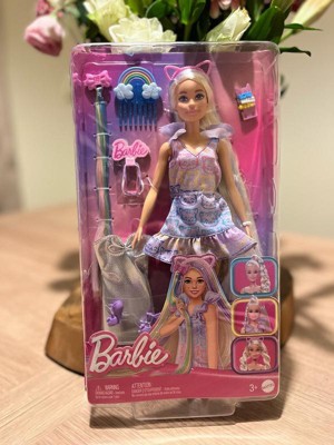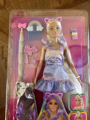 [This review was collected as part of a promotion.] Beautiful Barbie with extra long hair and 2 different outfits! Her blonde hair with purple and blue streaks is so fun to brush and style. She comes with clips, hairbands and an adorable kitty cat ear headband that can be styled with her multicolored kitty cat dress or with her other dress. My daughter loves brushing her hair and adding the streaked hair clip in. Definitely a delightful gift for the Barbie lover in your life!