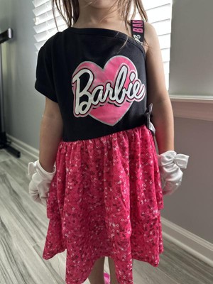 Get ready for an adventure in the Dreamhouse in this fashionable Barbie outfit! This comfy party dress features cool asymmetrical sleeves, a pretty ruffle hem skirt, a cute 3D bow on the waist, and artwork of the iconic Barbie logo that your little girl will love to wear! Made of a soft material that keeps your little fashionista comfortable, this stylish Barbie dress is the perfect outfit for all day fun and play! BARBIE (R) and associated trademarks and trade dress are owned by, and used under license from, Mattel. (c) 2023 Mattel.