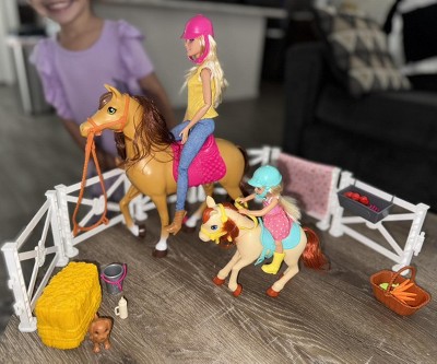 Barbie doll and her little sister Chelsea doll let young horse lovers play out their dreams of owning their own horses with the Barbie Hugs 'n' Horses doll and horse playset -- more than 15 pieces include two dolls, a horse, a pony and a puppy, plus accessories to create a corralled space and care for the pets. And it's easy to feel the love -- the horse and pony both have bobbling heads that mimic real movement for nuzzling and hugs! Soft manes and tails add to the realism and immersive experience. Kids can play out feeding, grooming and horseback riding while telling stories of friendship, family and adventure. Imaginations can ride anywhere because when a girl plays with Barbie, she imagines everything she can become! Dolls cannot stand alone. Colors and decorations may vary.