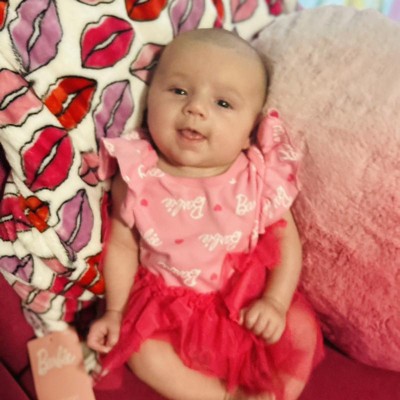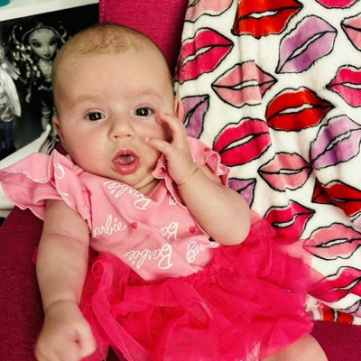• Officially licensed Barbie newborn and infant short sleeve bodysuit with layered ruffle skirt