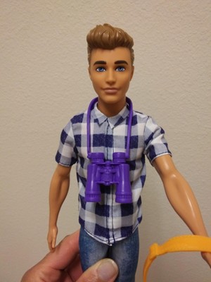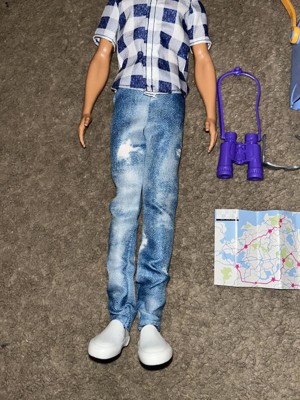 - Dressed in his signature camping look, Ken doll wears a plaid "button-up" shirt, distressed jeans and casual white sneakers.