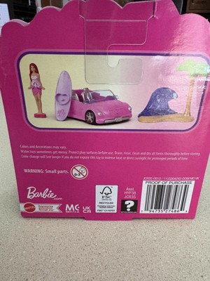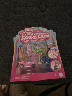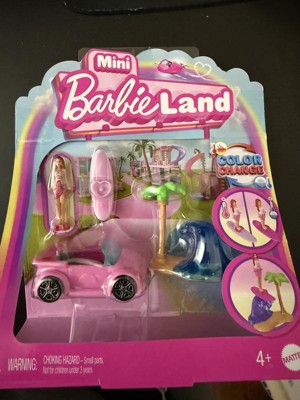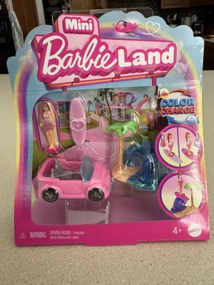 Enter the world of Barbie doll with Mini BarbieLand -- a place to imagine big and Dream in Mini! Sweet rides made with surprise, these mini vehicle sets are ready for play or display. This small-scale recreation of the Barbie beach convertible includes a surfboard featuring color-change and a scene accessory with wave and palm tree. The set comes with an adorably styled 1.5-inch Barbie doll that bends at the waist so she can sit and drive toward big adventures in Mini BarbieLand. Fans ages 4 years and older will want to collect all these cute wheels to build their own mini world! Each sold separately, subject to availability. Colors and decorations may vary.
