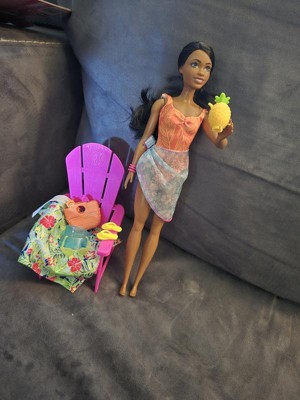 [This review was collected as part of a promotion.] Barbie goes hawaiian. Doll is very cute with her own chair. Granddaugthers loved it. They played with her all day. She comes with a visor and sunglasses. She has a sarong and bathing suit. The chair and pineapple drink are a nice touch.