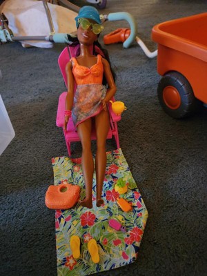 [This review was collected as part of a promotion.] This Barbie comes with the following accessories: beach chair, beach bag , sandals, sun hat, sunscreen, popsicle . Perfect for beach pretend play. My 4 and 5 year olds loved playing with this play set. They continuously search for this toy to play .