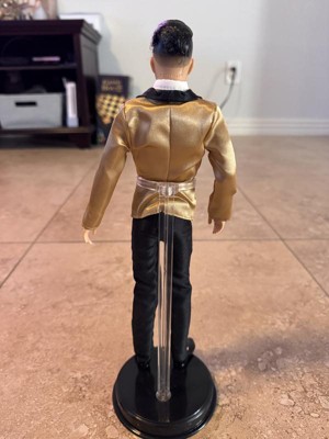 [This review was collected as part of a promotion.] This Ken is great!! I like the fact that he has a unique face sculpt. The gold outfit is perfect for the holidays. He is definitely a must have for any little girl or collector. He comes with a stand and you can pose him in many different poses.