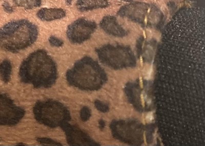 - A soft leopard belt accentuated with a gold waist chain, bold thigh-high boots and gold accessories complete her look