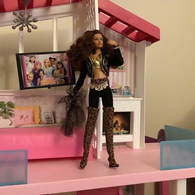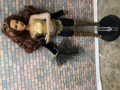 Barbie® honors legendary singer and songwriter, Gloria Estefan. Taking inspiration from her Cuban heritage to blend Latin rhythms with pop and dance beats, Estefan’s unique sound catapulted her to stardom, making her one of the most successful crossover artists in the world. Gloria Estefan Barbie® doll celebrates the chart-topping 1989 hit, “Get on Your Feet.” Inspired by the iconic music video, Barbie® doll’s black jacket features intricate gold detailing with jeweled accents and a dramatic, oversized lace sleeve. A soft leopard belt is accentuated with a gold waist chain, while bold thigh-high boots and gold accessories complete her look. A microphone accessory and doll stand make this posable doll ideal for display. Doll cannot stand alone. Colors and decorations may vary.
