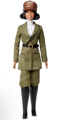 - Bessie Coleman Barbie doll wears a traditional olive-green aviator suit, tall lace-up boots and a cap emblazoned with her initials: “BC”.