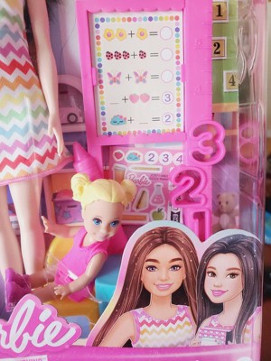 [This review was collected as part of a promotion.] This Barbie set is used with many other in the livingroom, playroom, and has even seen the outdoors playing with the neighbor kids. It comes with the teacher Barbie and board. The preschooler doll and accessories are a great addition to be able to play school with Barbies. My girls add additional Barbies to the classroom!