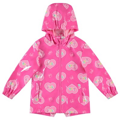 Keep your little one stylish and dry with this Barbie rain jacket! Featuring a zip-up design and a waterproof hood, this coat is perfect for any rainy day. Available in sizes for both little and big kids, this jacket is adorned with a fun heart print and iconic Barbie logo that your child will love. Whether they're playing outside or heading to school, this jacket will keep them protected from the elements. Don't let the rain stop your child's fun, grab this Barbie rain jacket today! BARBIE (R) and associated trademarks and trade dress are owned by, and used under license from, Mattel. (c) 2025 Mattel.