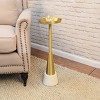 This small cocktail table is easy to move and measuring at 24-inches high, it is the perfect companion for your sofa or chair. The 8-inch round metal tabletop is the perfect size to rest your drink or device on. Durable and stylish, the marble table base add style and grace, The gold table sat and Try table top makes the Barclay table the perfect side table.