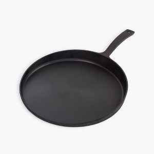 Lighter than a skillet and smaller than a griddle, the newly updated Cast Iron Flat Pan, now called the Skillet Griddle, deserves a dedicated space in your cast iron collection. The new version features a circular 12” polished interior, better heat distribution, and a more ergonomic extended handle, making this an ideal pan for open fire and kitchen cooking. Flipping and serving dishes like crepes, pancakes, tortillas, and pizzas is made easy with a low front ridge and open sides. Pre-seasoned with organic sunflower oil and ready to use right out of the box.