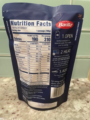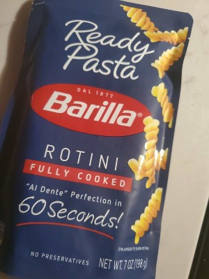 - 7-ounce pouch of fully cooked rotini pasta made with three simple ingredients—a touch of extra virgin olive oil, a dash of sea salt, and Barilla pasta