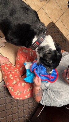 [This review was collected as part of a promotion.] Luna loves her toy. Very durable has a squeaker large enough for her to tug at. I’m usually scared of rope toys for dogs but no pieces have unraveled. She loves and so do we