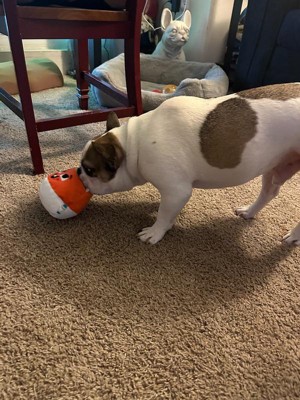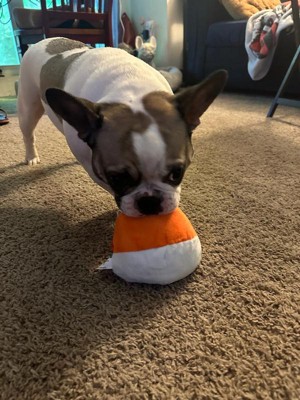 [This review was collected as part of a promotion.] This cute little dog toy was fun for my dog and she got excited when getting it. I like how it was two toys in one, with the ball being fun to chase and the candy corn being something for her to dig in for treats. She doesn’t really chew up toys too much so I can’t say whether it would withstand a lot of wear and tear, but she was digging in it to get the treats I put in there and so far no rips. Bonus points for being halloween themed!!